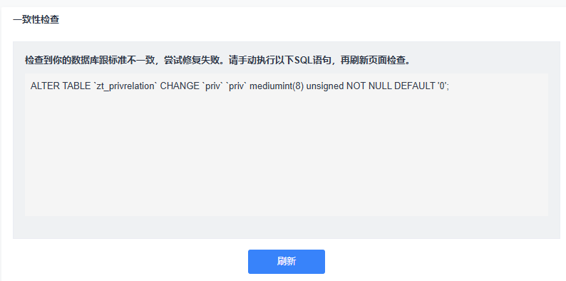检查到你的数据库跟标准不一致,尝试修复失败。请手动执行以下SQL语句,再刷新页面检查。