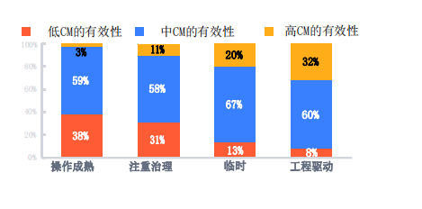 当从总体上看变革管理的有效性时,会发现工程驱动的公司具有最高水平的变更管理有效性,临时型公司因缺乏流程而成功率居于第二,剩下的两组严重依赖正统的认可,在有效性上得分不高。