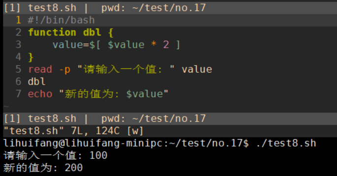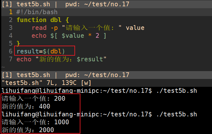 可以用函数的输出来获得任何类型的函数输出,并将其保存到变量中。result='dbl'这个命令会将dbl函数的输出赋给$result变量。