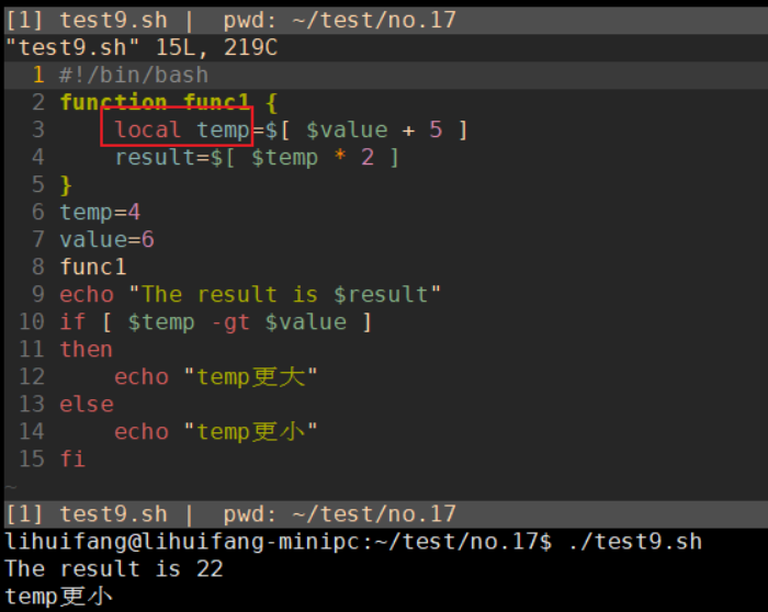 函数内部使用的任何变量都可以被声明成局部变量。要实现这一点,只要在变量声明的前面加上local关键字就可以了。local temp