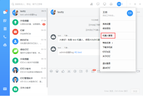 在钉钉中通过下图两种方式添加机器人,选择【自定义机器人】,按照提示操作。机器人添加完成后,在禅道中添加一个类型为【钉钉】的Webhook,填入从钉钉机器人获取的 Webhook 地址,即可发送消息到钉钉。需要特别提醒的是,钉钉的消息发送方式默认为同步发送,不能修改,并且目前钉钉对自定义机器人发送消息的频率做了限制,每分钟最多发送20条消息。