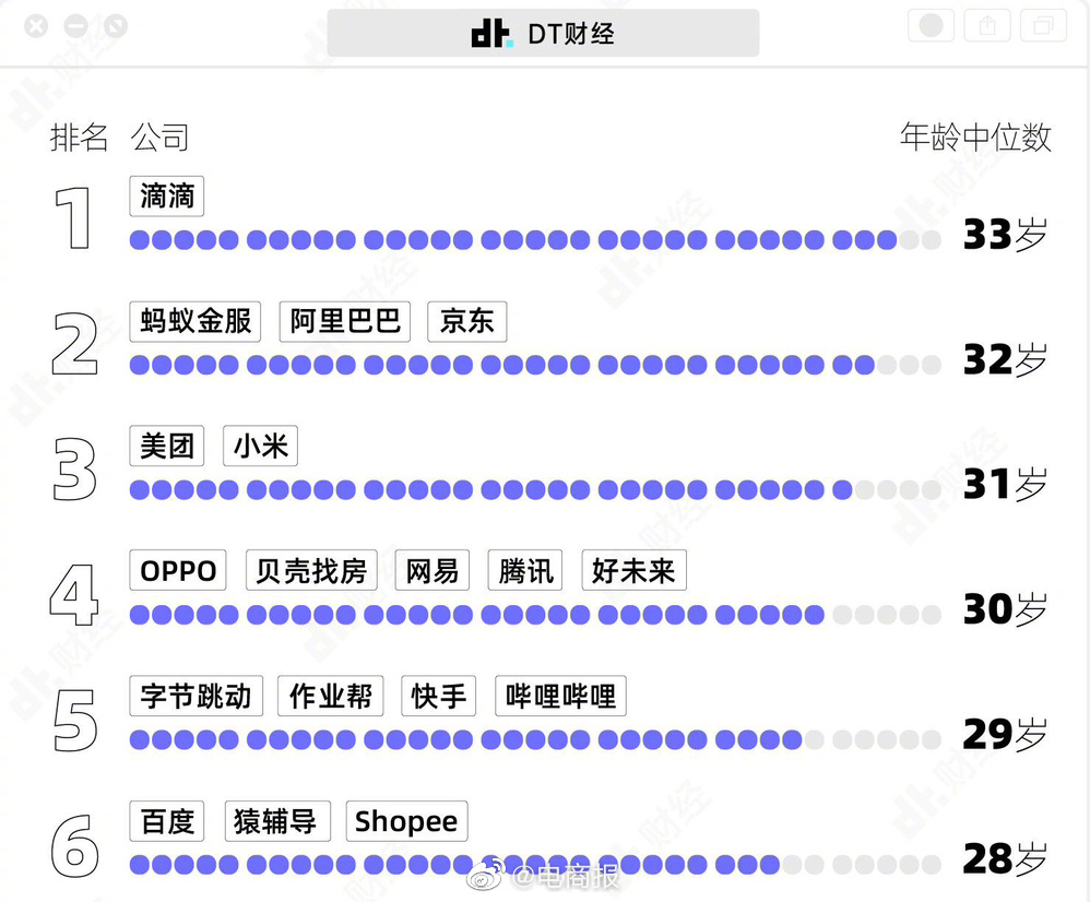 根据DT财经数据得出:主要互联网公司员工年龄中位数大多低于35岁,最“老”的也才只有33岁。