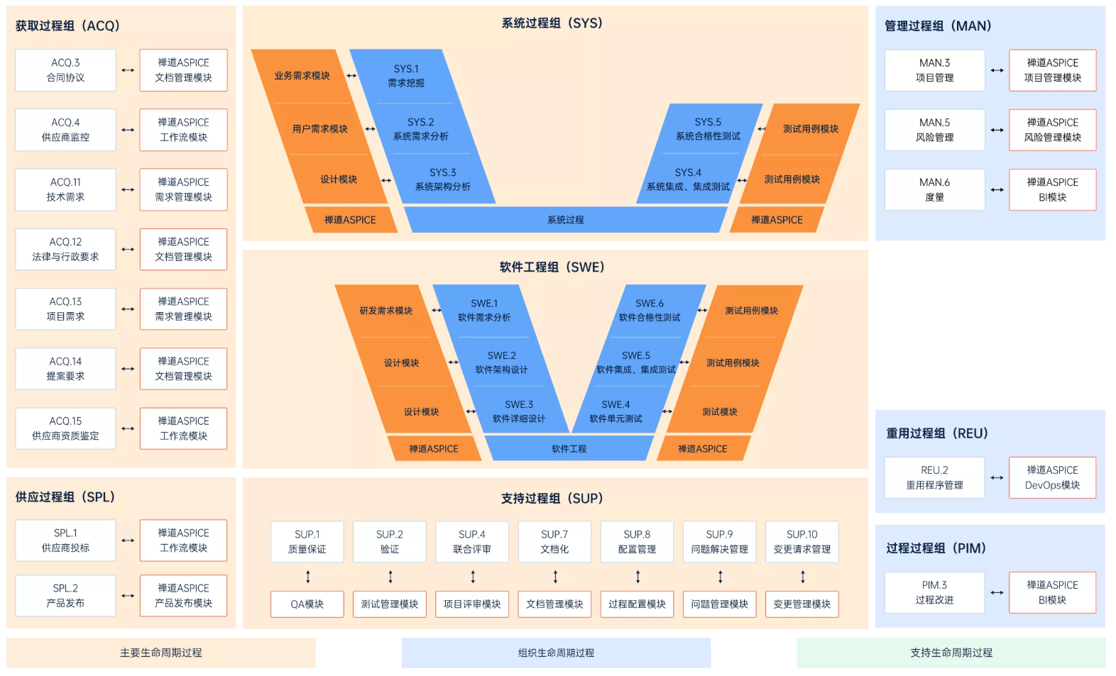 禅道ASPICE版本深度融合了标准的双V开发模型,强化验证与确认环节的闭环管理,显著提升产品的一致性和合规性。将测试环节作为一个与开发环节紧密集成、统一管理的整体,从而帮助企业加快反馈循环,显著提升测试效率,显著提升产品开发的一致性和合规性。3、覆盖ASPICE全过程域,合规认证水到渠成