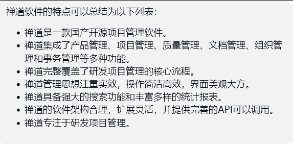 你将得到使用【】包含起来的文本,请总结文中讲述的特点,请用列表返回。【禅道由禅道软件(青岛)有限公司开发,国产开源项目管理软件。它集产品管理、项目管理、质量管理、文档管理、组织管理和事务管理于一体,是一款专业的研发项目管理软件,完整覆盖了研发项目管理的核心流程。禅道管理思想注重实效,功能完备丰富,操作简洁高效,界面美观大方,搜索功能强大,统计报表丰富多样,软件架构合理,扩展灵活,有完善的API可以调用。禅道,专注研发项目管理!】