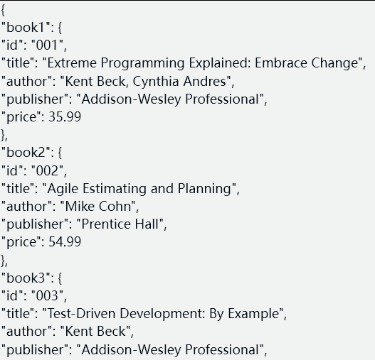 请推荐三本关于极限编程方面的书,请返回json格式,字段如下:id,title,author,publisher,price