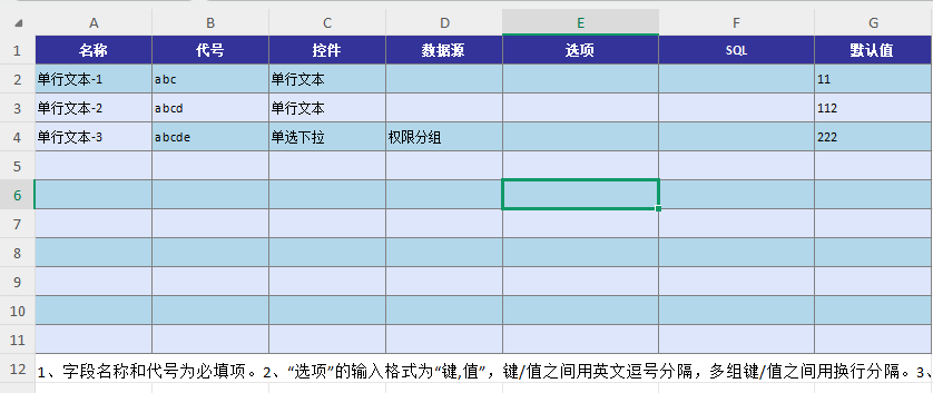 2、模板导入:在高级编辑器内提前下载模板,在模板提供的Excel表中添加字段,输入信息并保存后,导入并保存。