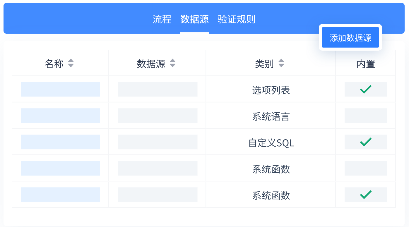 禅道工作流的另一个强大之处在于其丰富的自定义功能。可支持自定义表单、动作、审批流、列表、统计报表等几乎所有您能想到的流程元素。内置50+种数据源,提供4种自定义数据源的方式,包括自定义选项、SQL查询、调用禅道内置的方法和字段。
