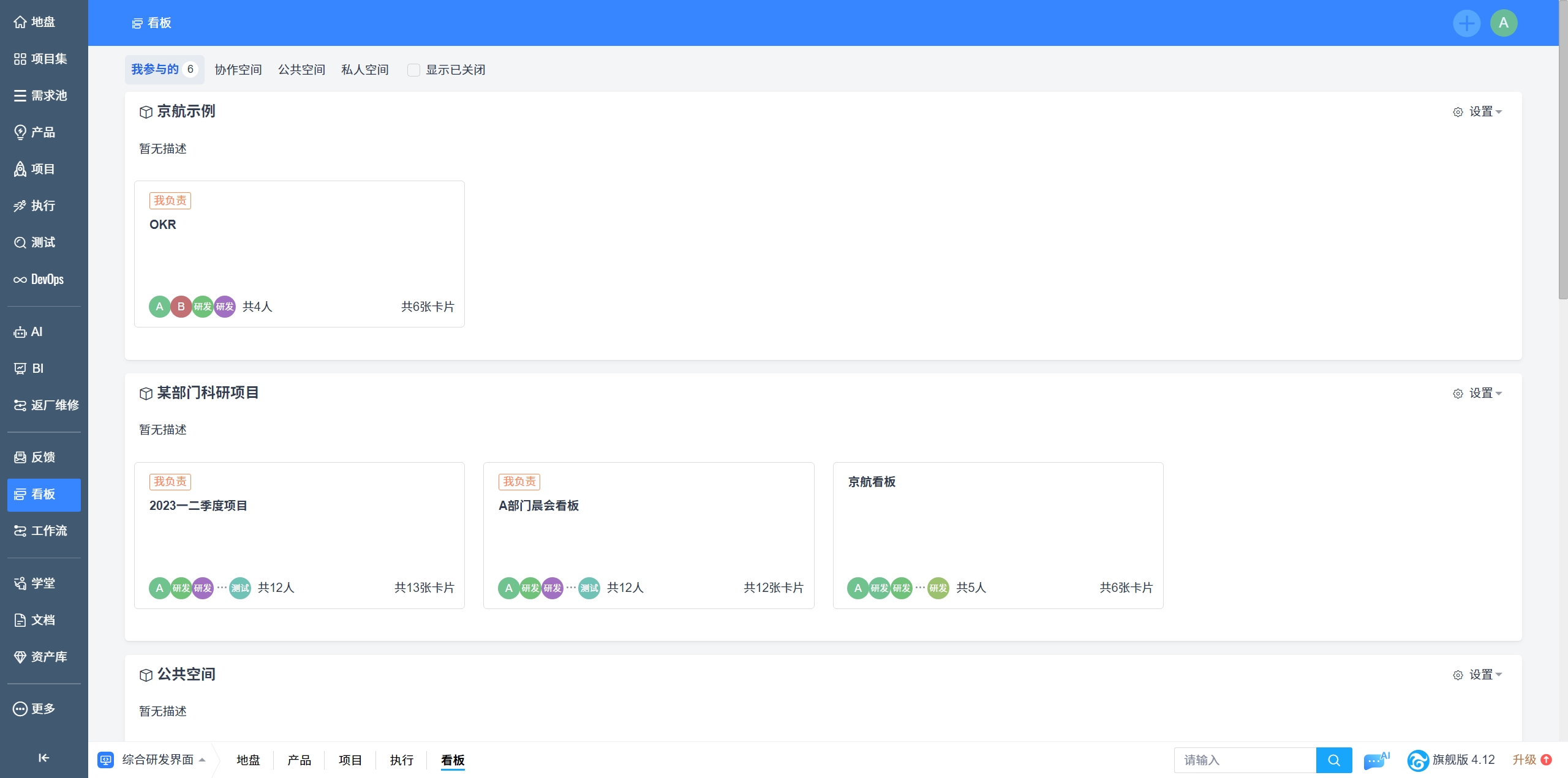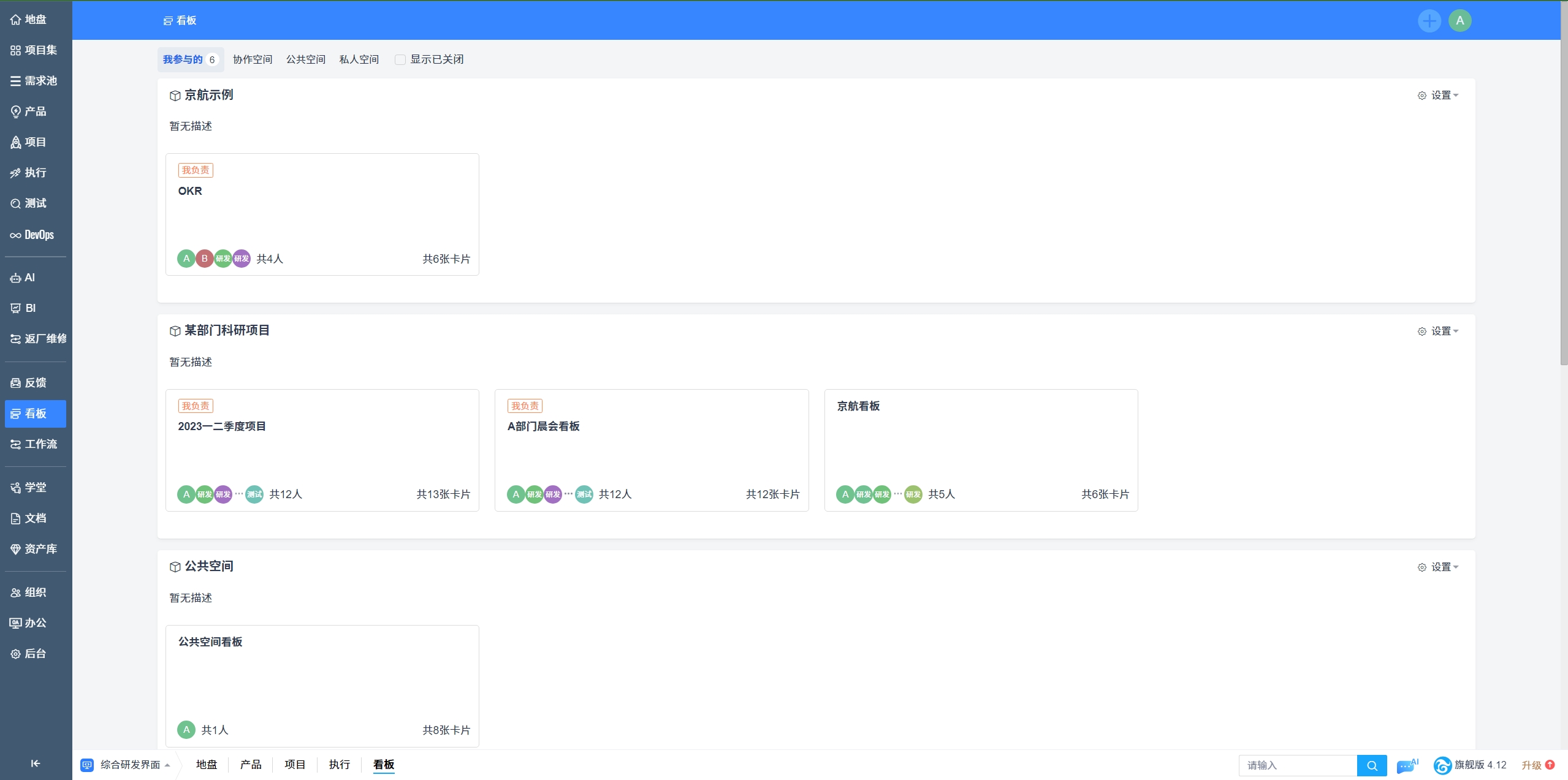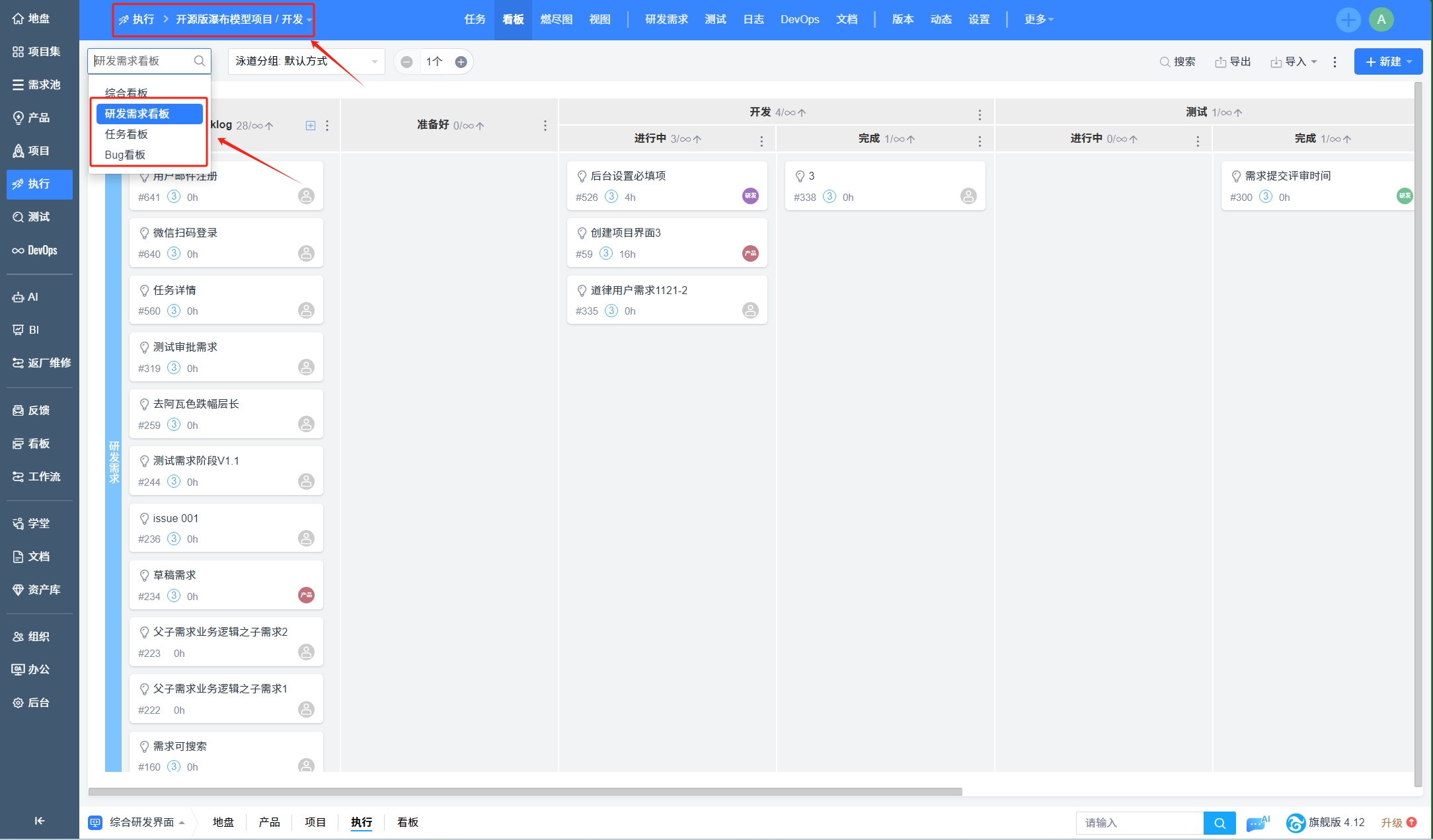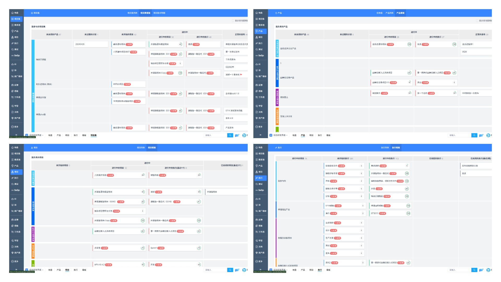 项目集看板、产品看板、项目看板和执行看板