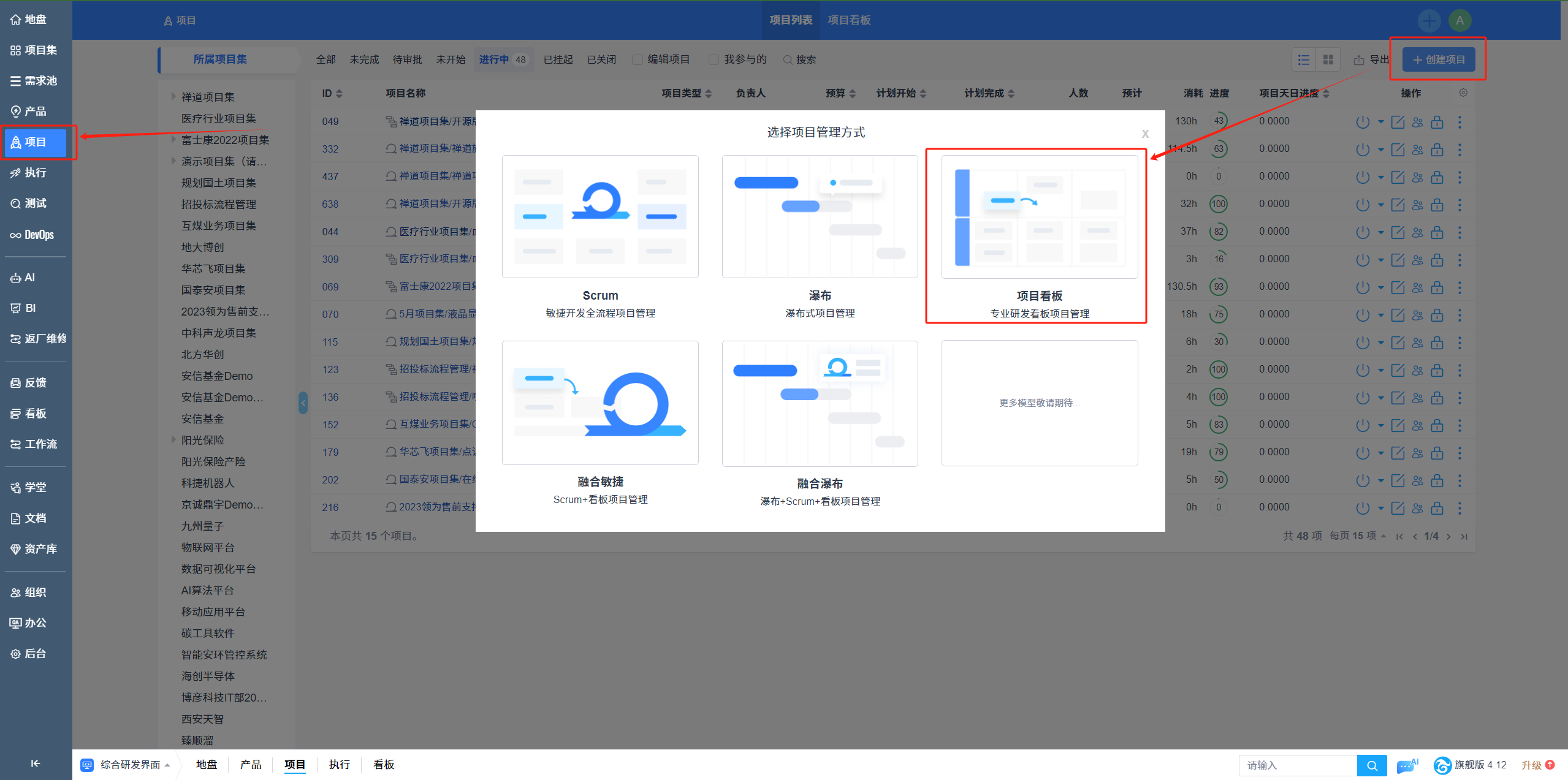 专业研发看板,面向研发团队使用。研发团队可以选择看板项目管理模型,点击【项目】→【创建项目】→【看板项目管理模型】,填写项目信息,即可完成创建。通过专业研发看板对项目进行可视化管理,提高研发团队项目的整体透明度,促进团队协作,保证项目有序进行。
