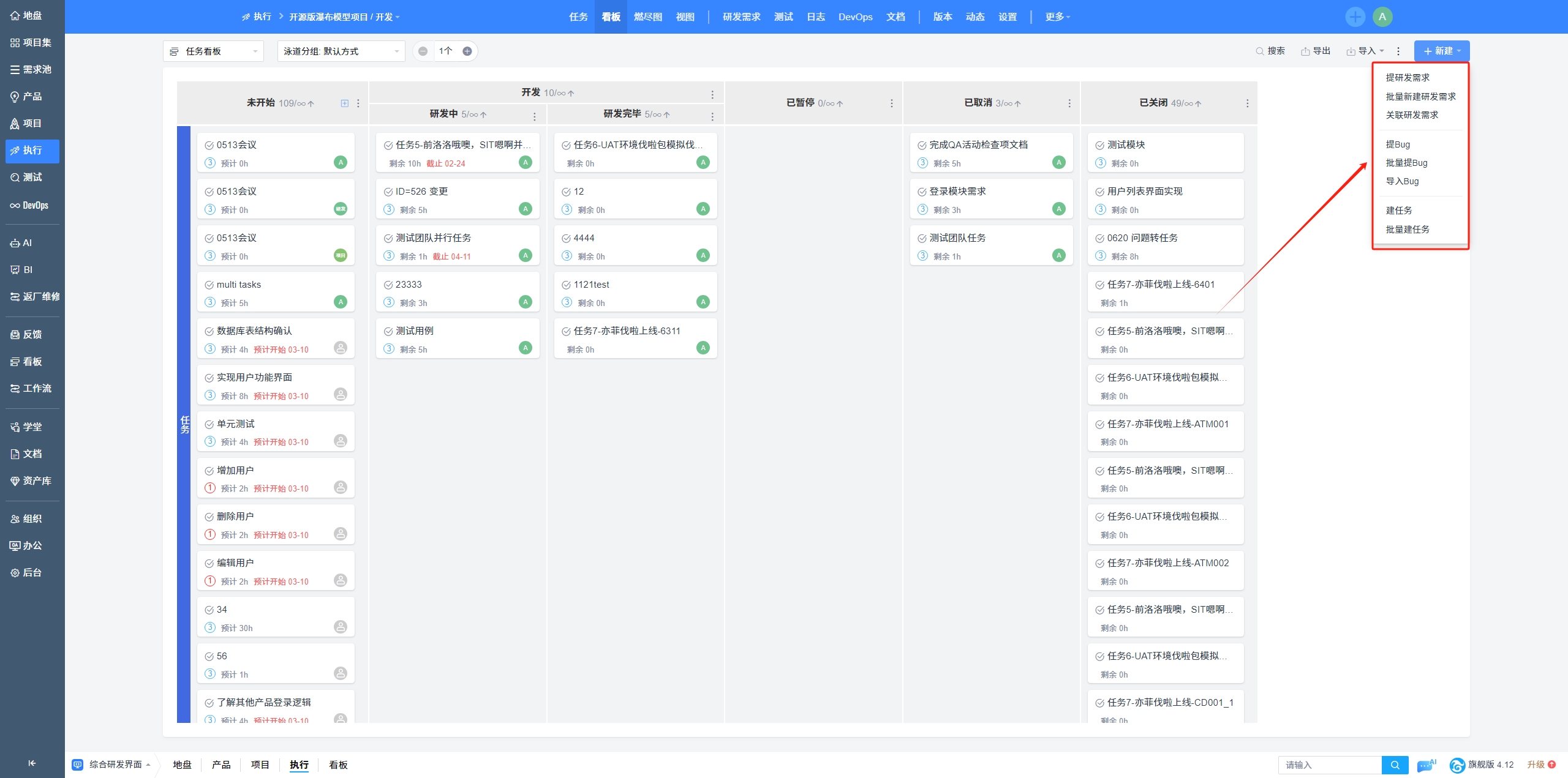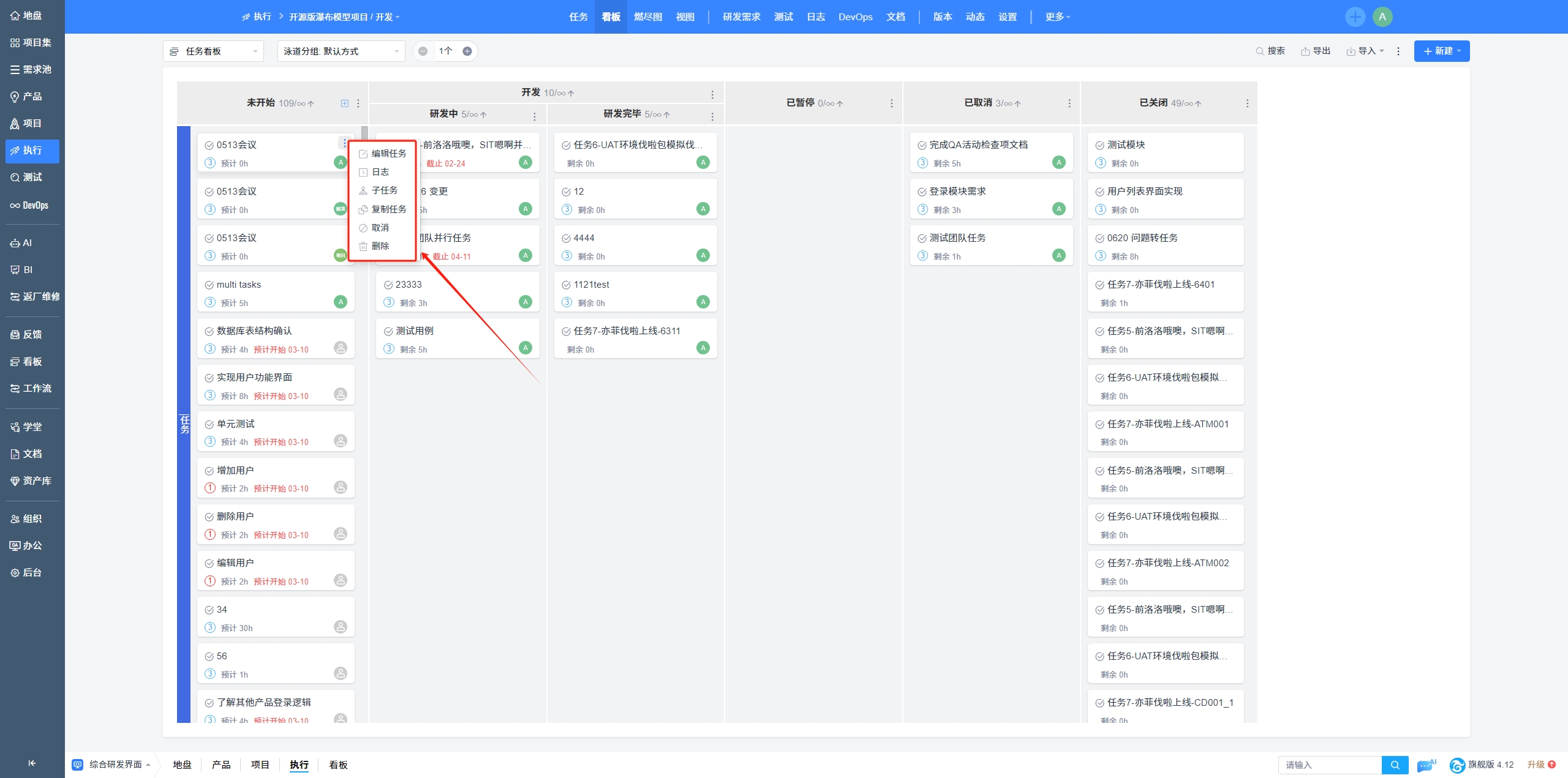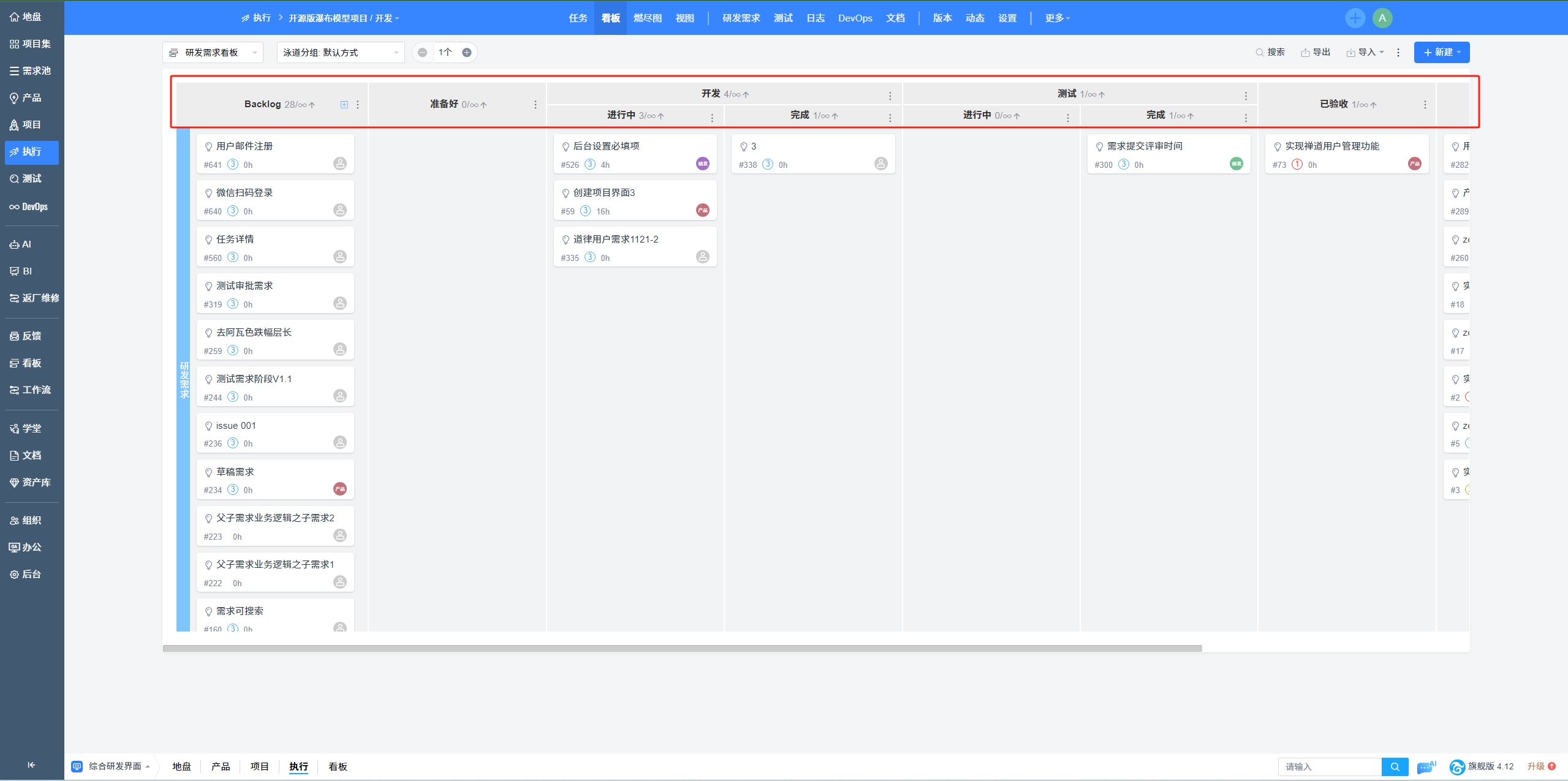 目前禅道支持:项目集看板、产品看板、项目看板、执行看板、研发中的需求/任务/Bug看板、专业研发看板和通用看板。