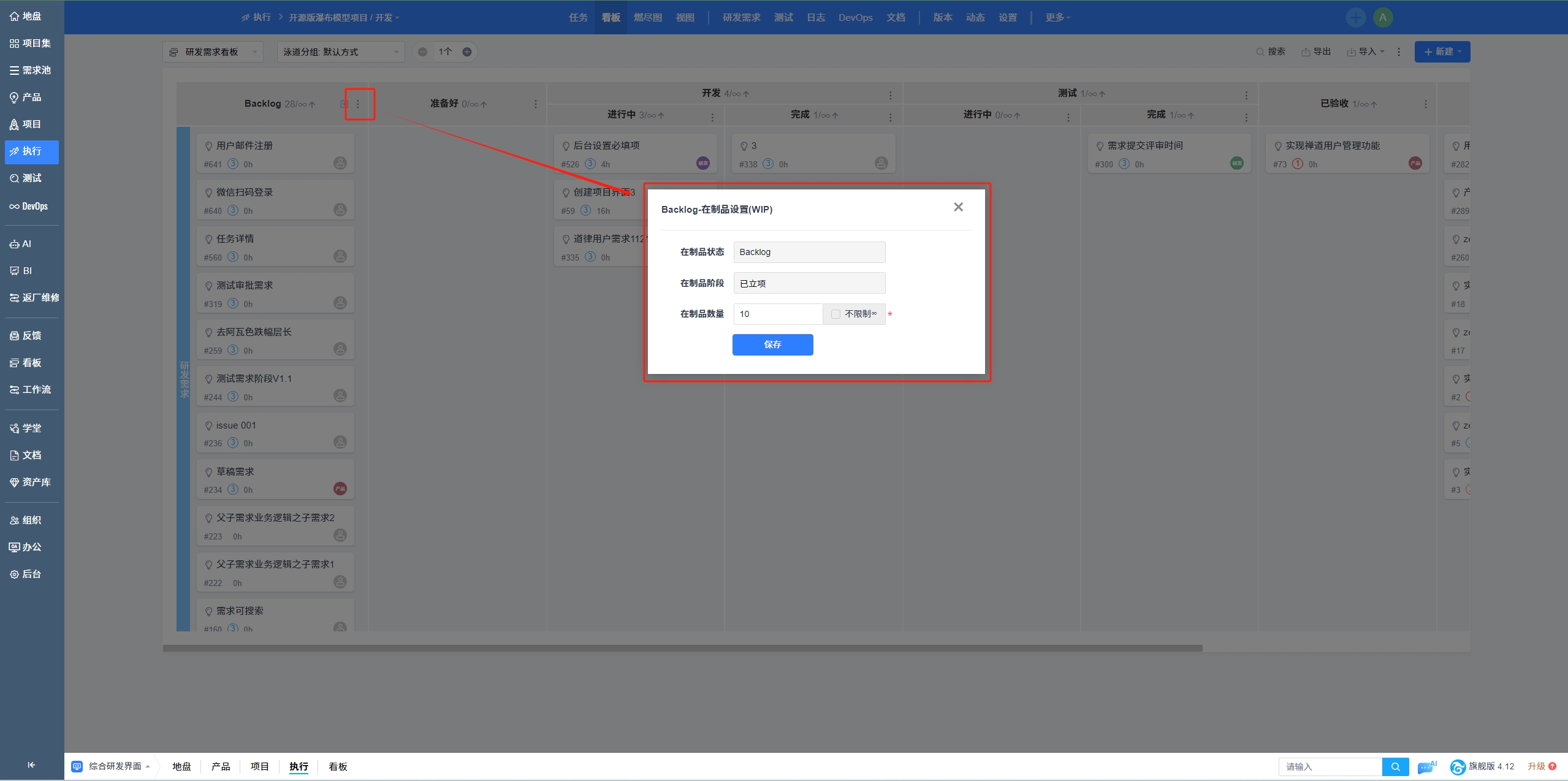 禅道看板支持在制品限制(WIP),通过限制每个流程阶段的在制品数量来避免大量工作并行导致的拥堵、浪费和延误,达到控制项目进展混乱的目的,促进工作项快速完成和交付。