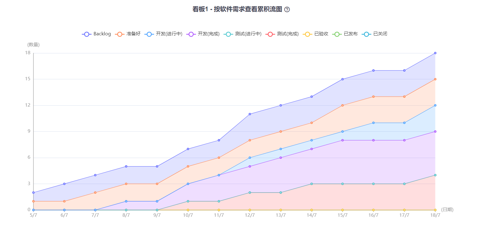 在累积流图中,横轴代表日期,纵轴代表工作项数量。不同颜色线条有着不同的含义。