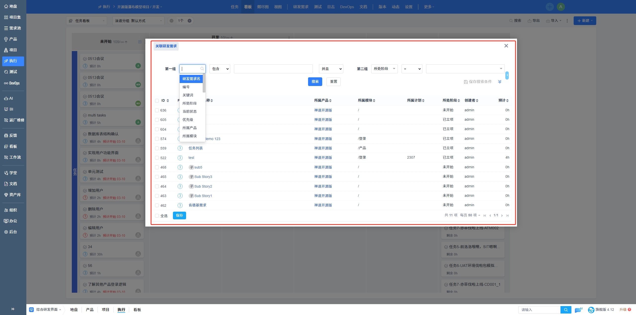 禅道专业研发看板与产品模块数据联动。看板中的操作,会同步更新到【产品】的需求/Bug列表中。通过单选、多选、全选以及搜索,能快速高效地找到关联需求,实现数据联动,真正实现项目的高效管理与协作。