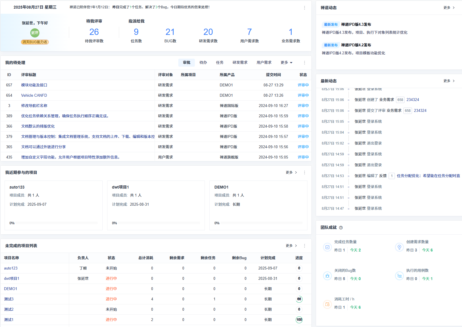 既然感知缺失是远程项目失控的重要原因之一,那么解决方案的核心就在于构建团队高感知的项目管理协作体系。禅道项目管理工具通过项目仪表盘、可视化工具链和自动化集成,在保持异步工作灵活性的同时,让团队对项目状态的感知始终保持同步。1.项目仪表盘:宏观感知项目状态