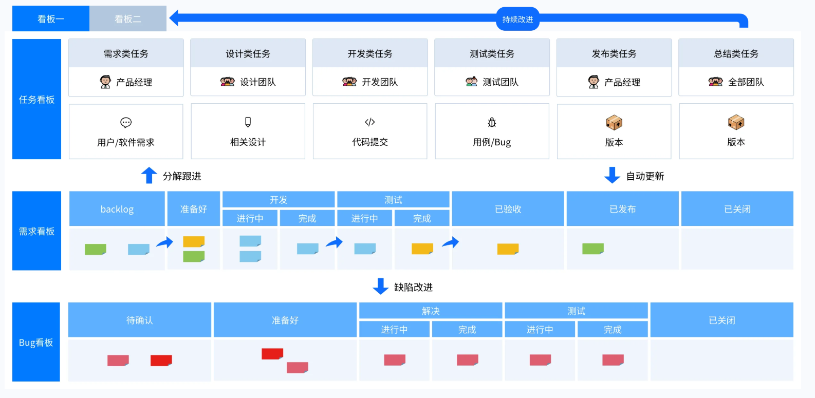 如果说仪表盘提供了宏观感知,那么看板和甘特图则提供了对工作流程的图像化展示。这些视图让每个成员都能快速找到自己的工作在整个价值链中的位置,建立起对流程和依赖的深刻感知。信息难同步,任务状态不透明?禅道看板让工作流程看得见
