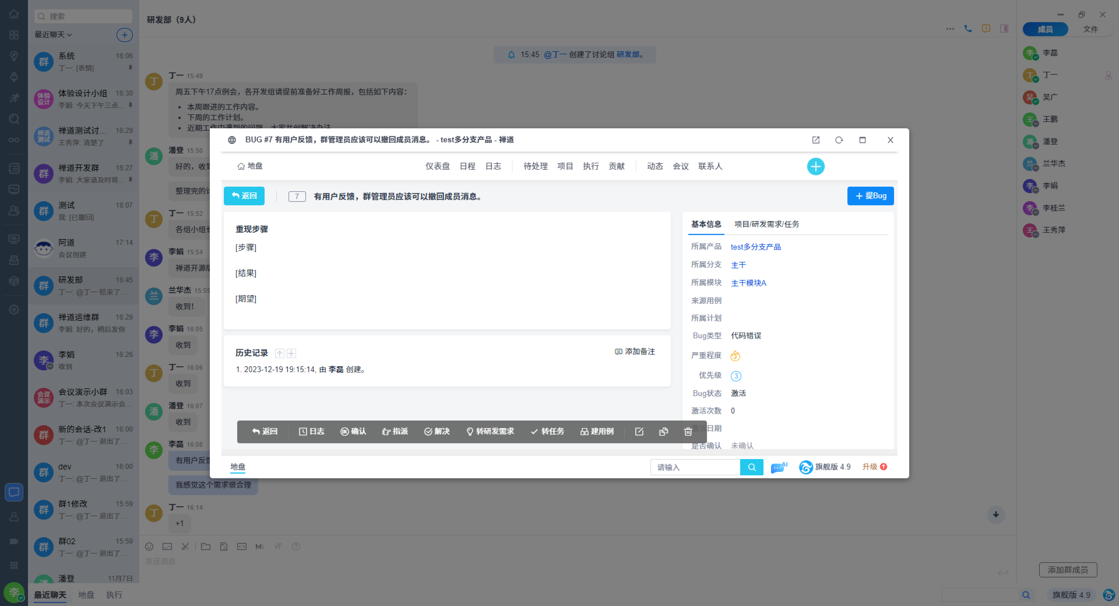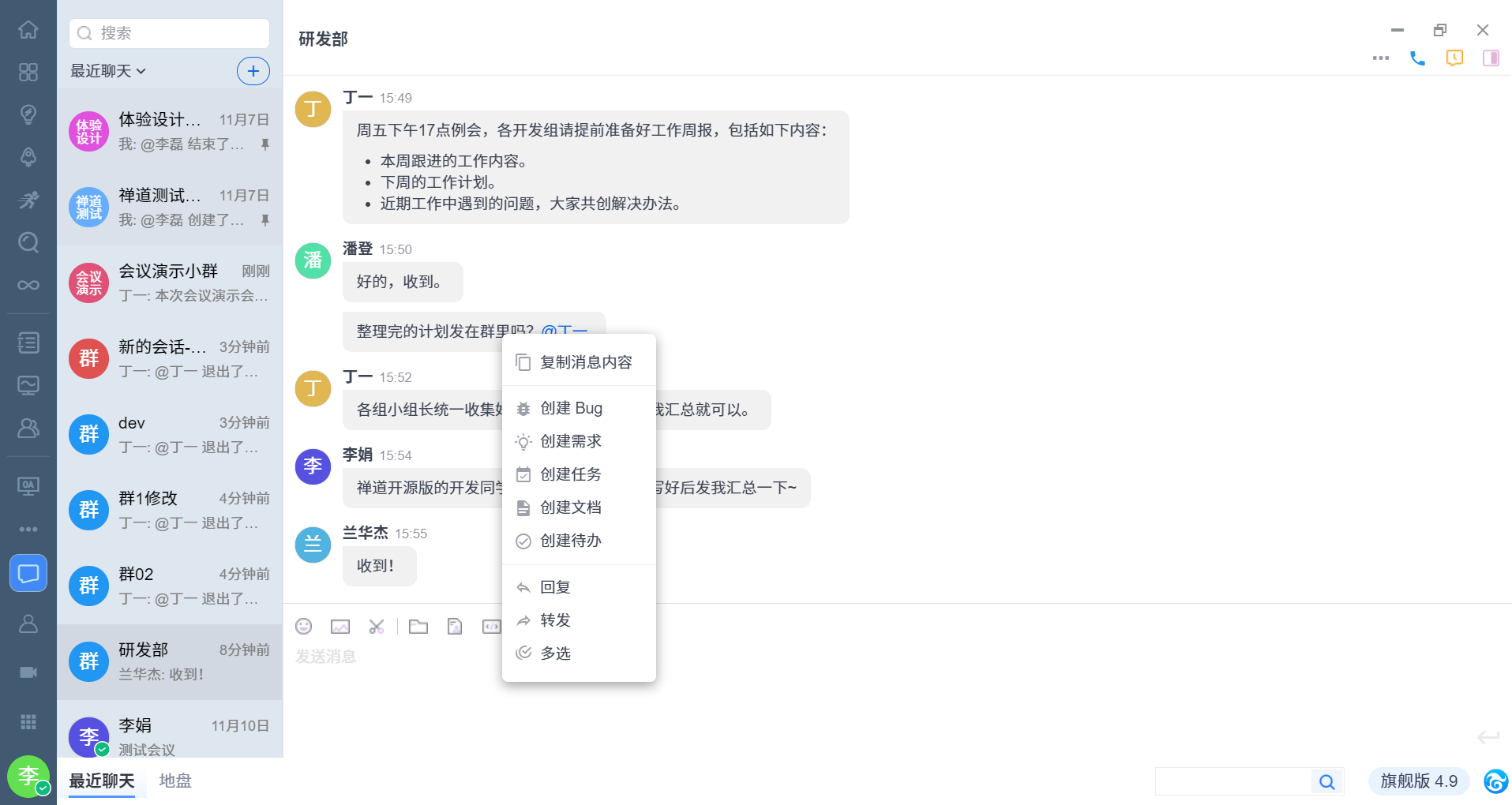 在禅道客户端中项目团队成员可以进行成员沟通、小组讨论、文件传输、任务指派等,聊天窗口右键直接将消息转为Bug/需求/任务,避免二次录入导致的信息丢失风险;关键信息实时推送至相关成员,真正实现高效管理和流程协作。