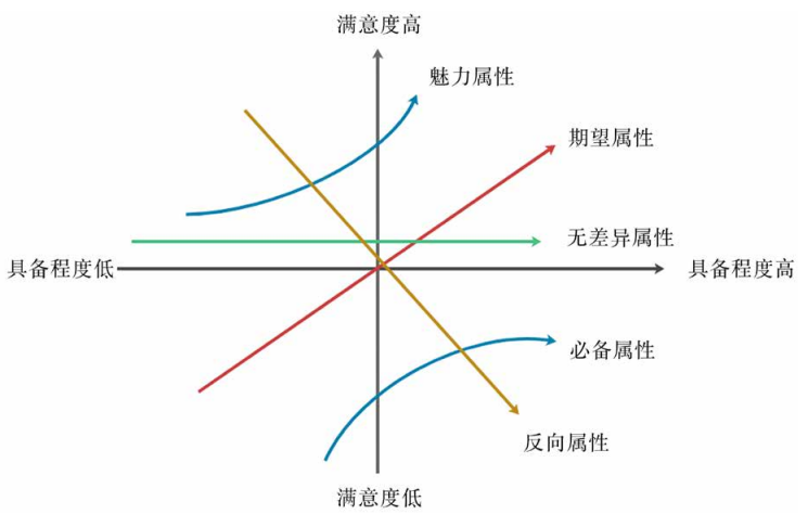 在KANO模型图中,纵轴代表顾客满意度,自下而上,满意度依次由低到高。横轴代表质量需求,由左至右,依次代表质量水平由低到高。它根据不同类型的需求属性与顾客满意度之间的关系,将产品或服务的属性分为以下五类。