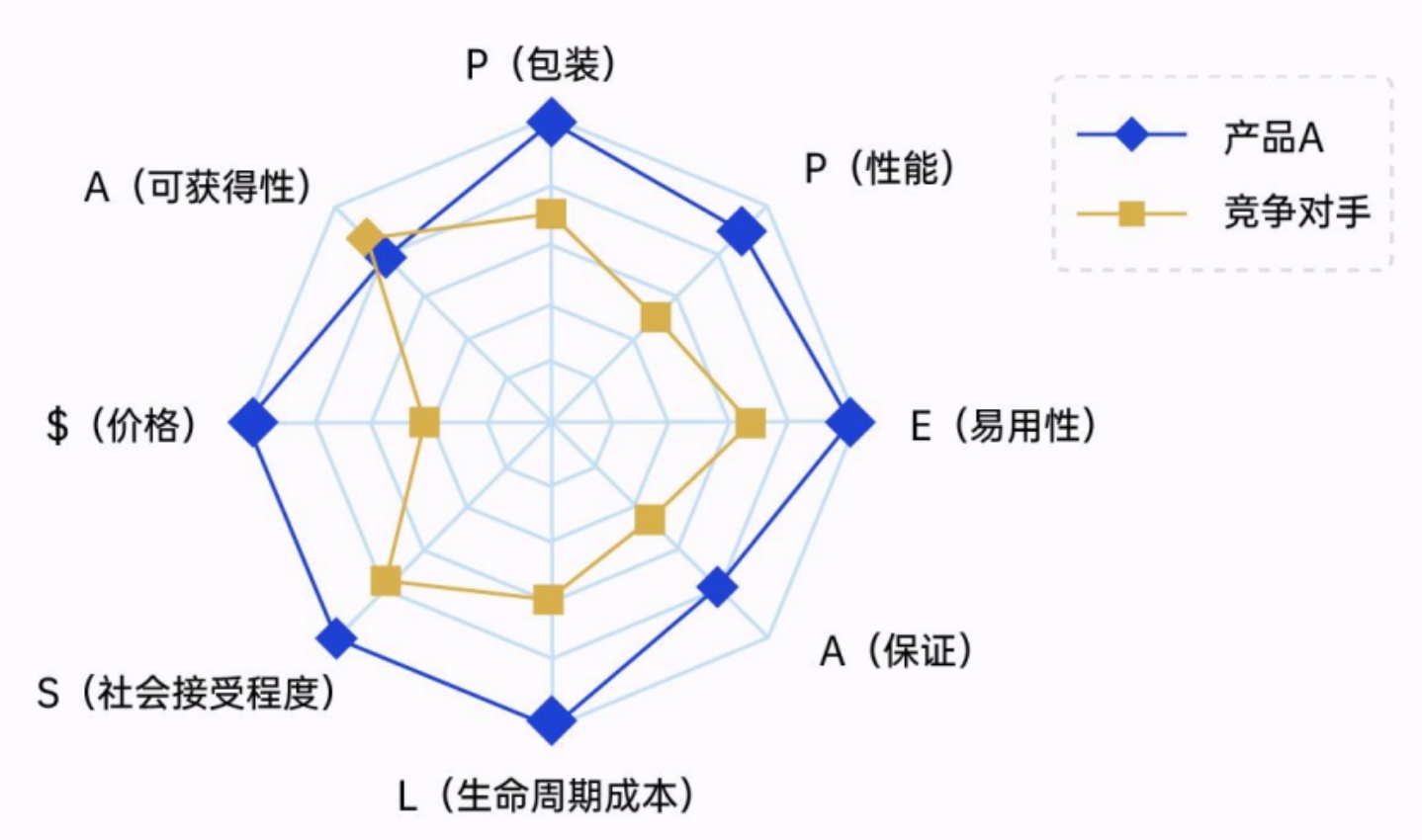 以$APPEALS为例,可将产品分为如下需求维度,更好地判断用户的期望、竞争对手的水平以及自身与行业标准之间的差距: