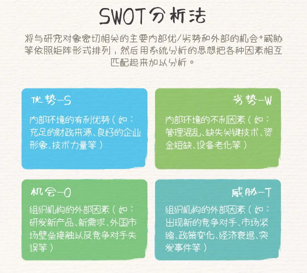 - SWOT分析:通过SWOT分析得出优势、劣势、机会、威胁,以便制定竞争策略。