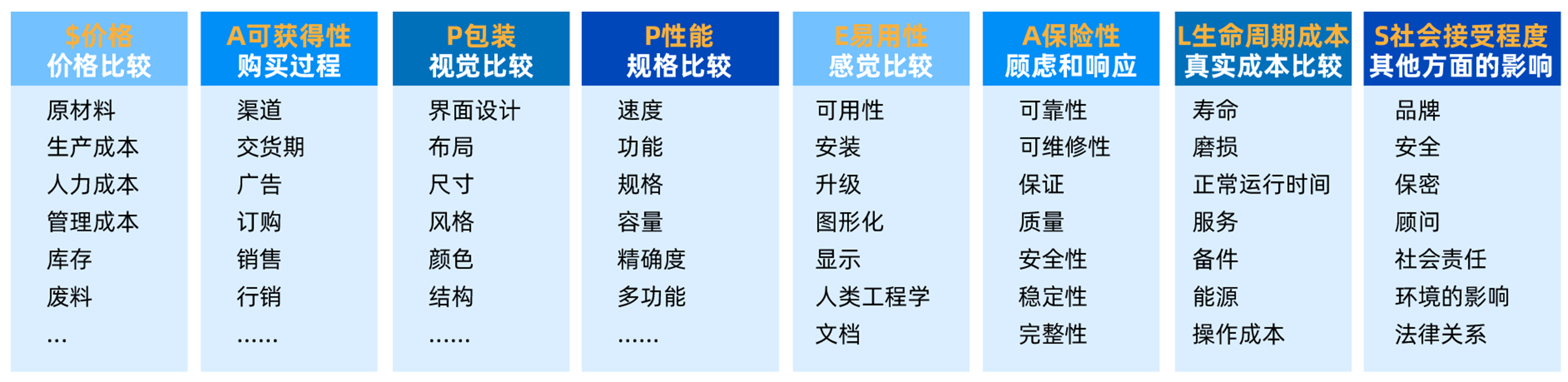 我们可以采用$APPEALS方法,进行用户视角的分析。$APPEALS方法是IBM在IPD方法论中总结出来的客户需求分析的一种方法。它从8个方面对产品进行客户需求定义。具体可以看看这篇文章:《$APPEALS模型是什么》