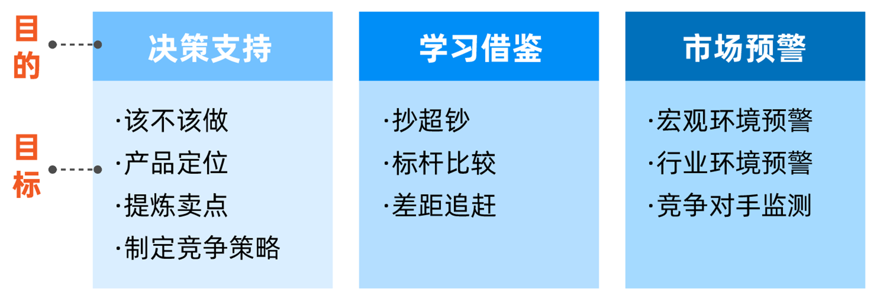 通过这个例子,搞明白了目的和目标的区别,在做竞品分析时就能更有方向性和针对性了。竞品分析常见的目的有三种:决策支持、学习借鉴、市场预警。