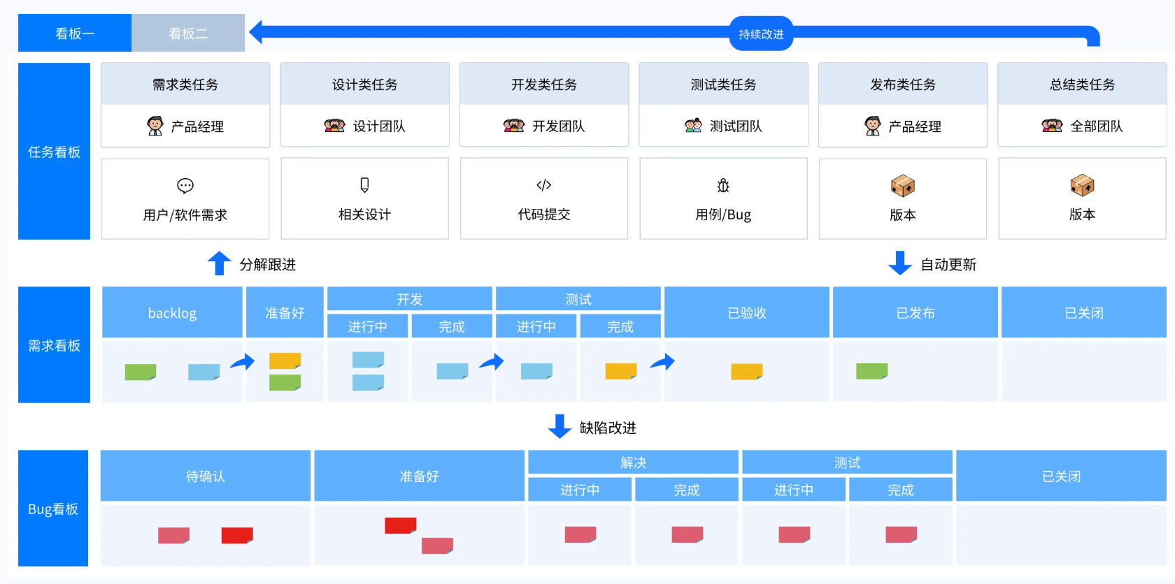 - 对内部团队,每天开15分钟站会,用每日站会的“昨天做了什么、今天要做什么、遇到什么阻碍”三个问题同步信息,高效发现问题,避免无效冗长的会议讨论;