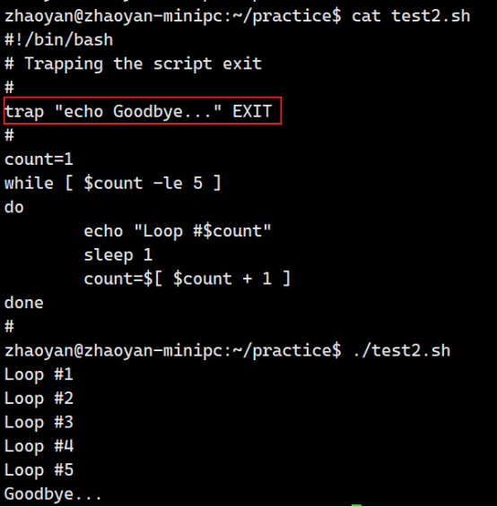 要捕获shell脚本的退出,只要在trap命令后加EXIT信号就可以。