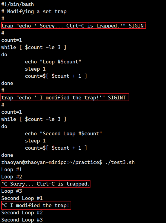 重新使用带有新选项的trap命令可以对脚本中不同位置进行捕获处理。