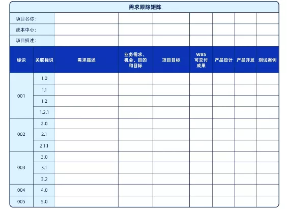 变更是项目中不可避免的因素,项目管理者的目标并不是去阻挡它们,而是通过科学的方法来管理和应对这些变更。这时借助一个需求管理来确保进度控制是非常必要的。很多项目团队会选择借助需求跟踪矩阵来对需求变更进行跟踪管理。利用需求跟踪矩阵,可以清晰地展现出需求与其它产品的功能要素的关联。这种矩阵的作用就是把产品的需求从它的起始点连接起来,形成一种能够满足需求的实际交付的表格。(如下图所示)