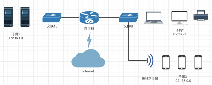原创互联网是一个庞大的分层网状结构,亿万的设备分布在其大大小小的子网中。这里我们展示了一个简化的办公网络,包括3个子网,子网间通过路由器相连,子网内部使用二层交换机或无线热点连接了一些电脑和办公设备。