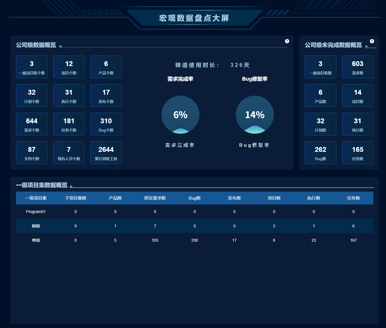 在经过项目目标拆分,任务逐一指派并执行过程中,这时候就可以借助BI效能管理功能,对项目进行实时监控。以前凭经验和滞后的数据做决策的管理者,现在打开禅道的BI大屏,几分钟之内就能查看到哪些项目延期了、哪个模块 Bug 最多、谁的工时利用率最高......这种数据驱动不仅让管理更科学,更能及时发现问题,一旦某个指标异常,立刻就能预警,采取应对措施。