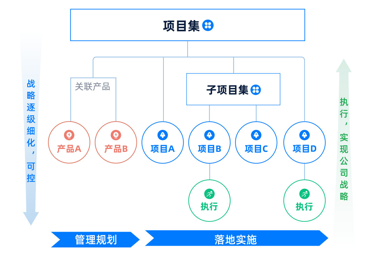 禅道中的项目集-产品-项目-执行四层结构,给战略目标的拆分提供了科学有效的拆分和行动路径。从战略管理到迭代开发,这种结构化分解确保每一项工作和任务,都能够为公司战略目标服务。