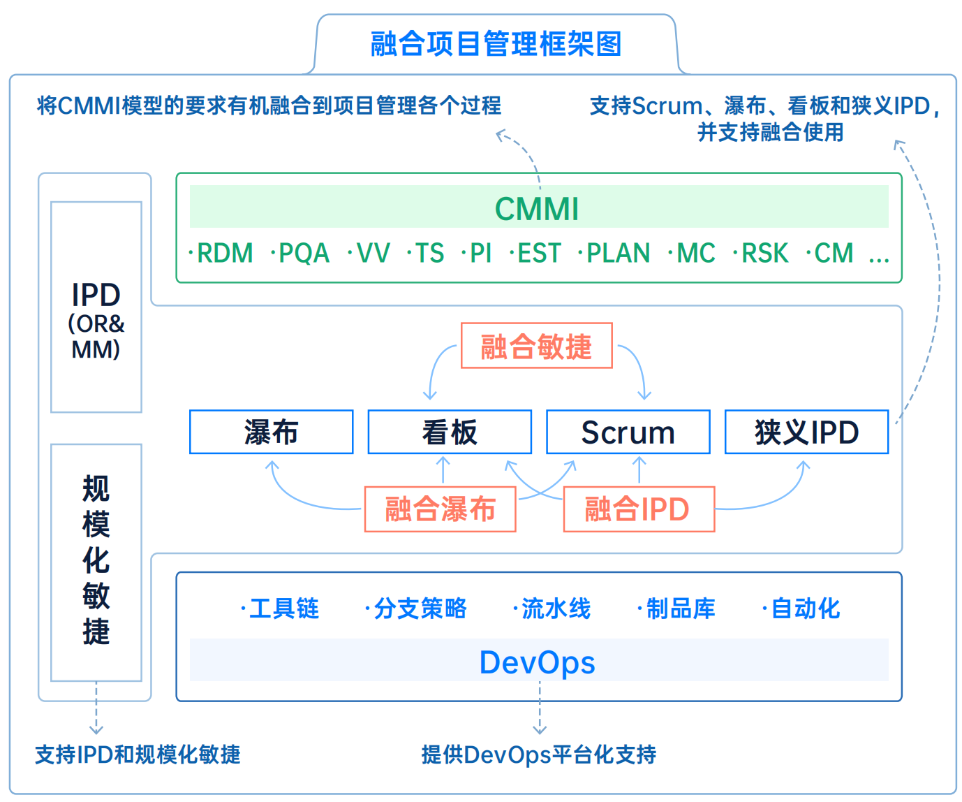 禅道集成了目前行业内推崇的七大主流项目管理模型,并且支持模型的混合使用。比如,做互联网产品迭代的团队可以用Scrum模型,搞硬件研发可以选择IPD,传统 IT 项目可以选择瀑布模型,甚至能混搭出“瀑布+Scrum”的融合瀑布模型。