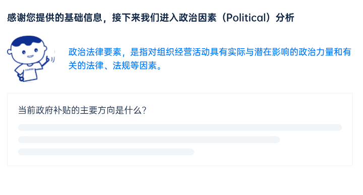 同时,企业决策解决方案通过步骤引导,将抽象的思维模型转化为可交互的问答,进行整体分析,并根据问答内容形成结构化的结果展示,帮助企业识别诸多关键因素,从而更合理、严谨地制定战略规划: