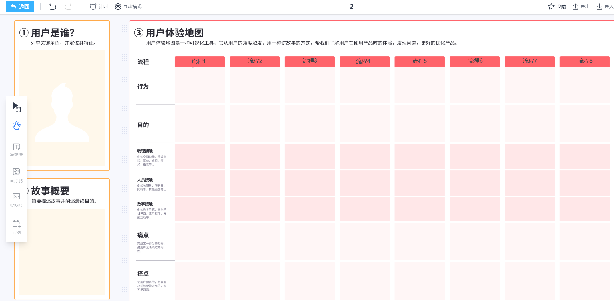 用户体验地图的核心是站在用户视角,以讲故事的方式梳理用户使用产品的全流程。在禅道协作白板中,团队可以直接拖拽便签拆解每个环节。
