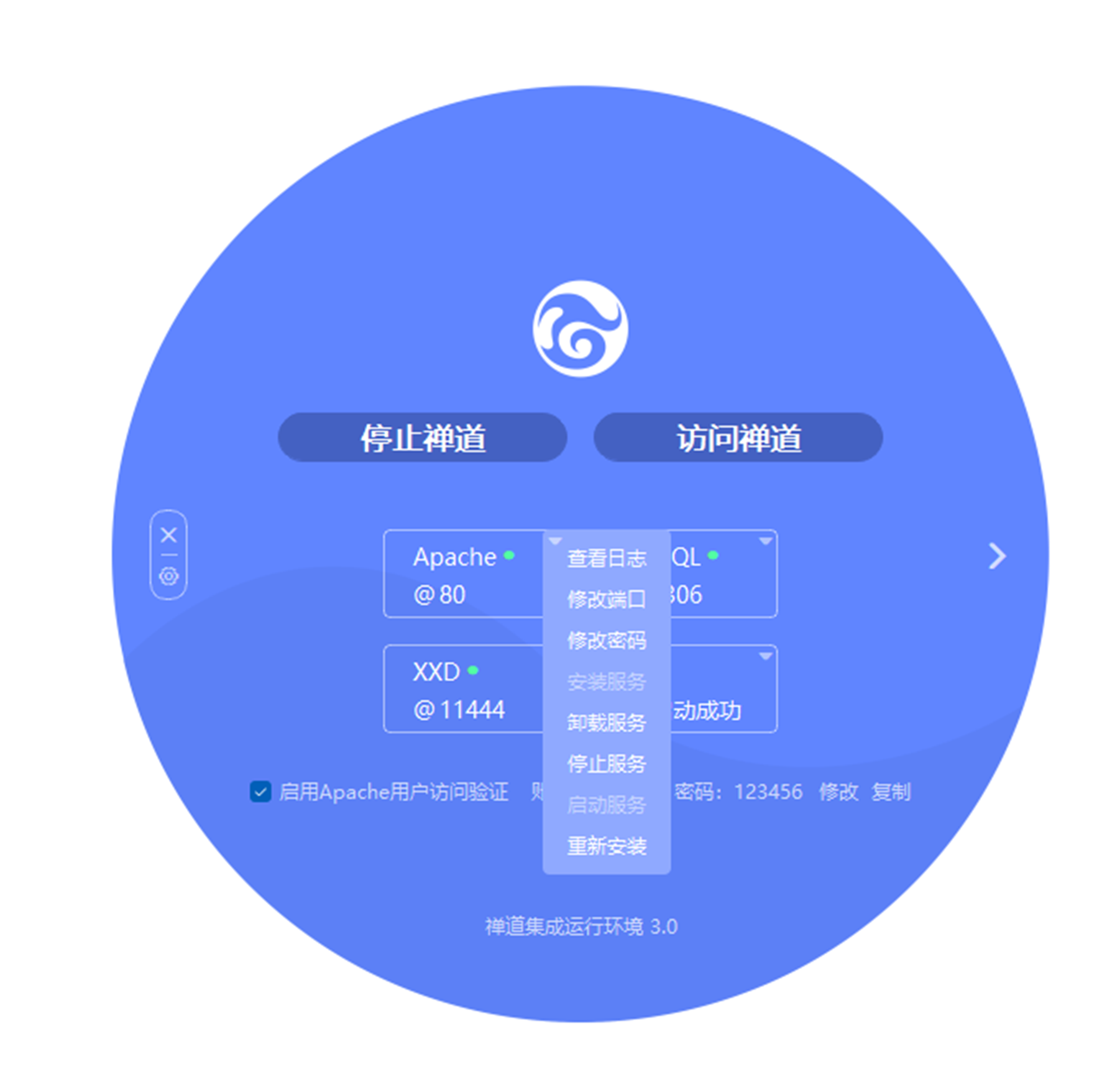 Apache可以进行查看日志、修改端口、修改密码、安装服务、卸载服务、停止服务、启动服务、安装服务操作。