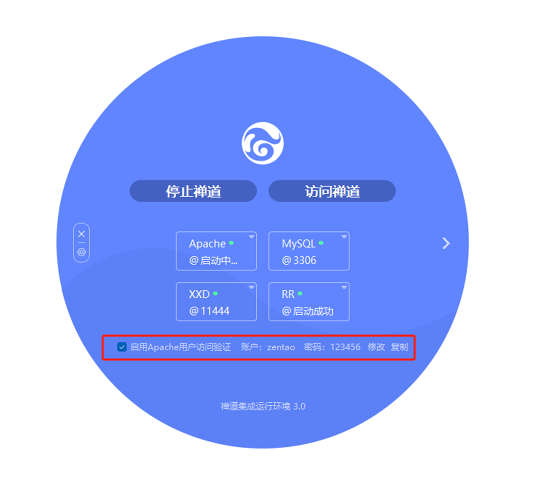 注:Apache用户访问验证的初始账号:zentao,密码:123456。