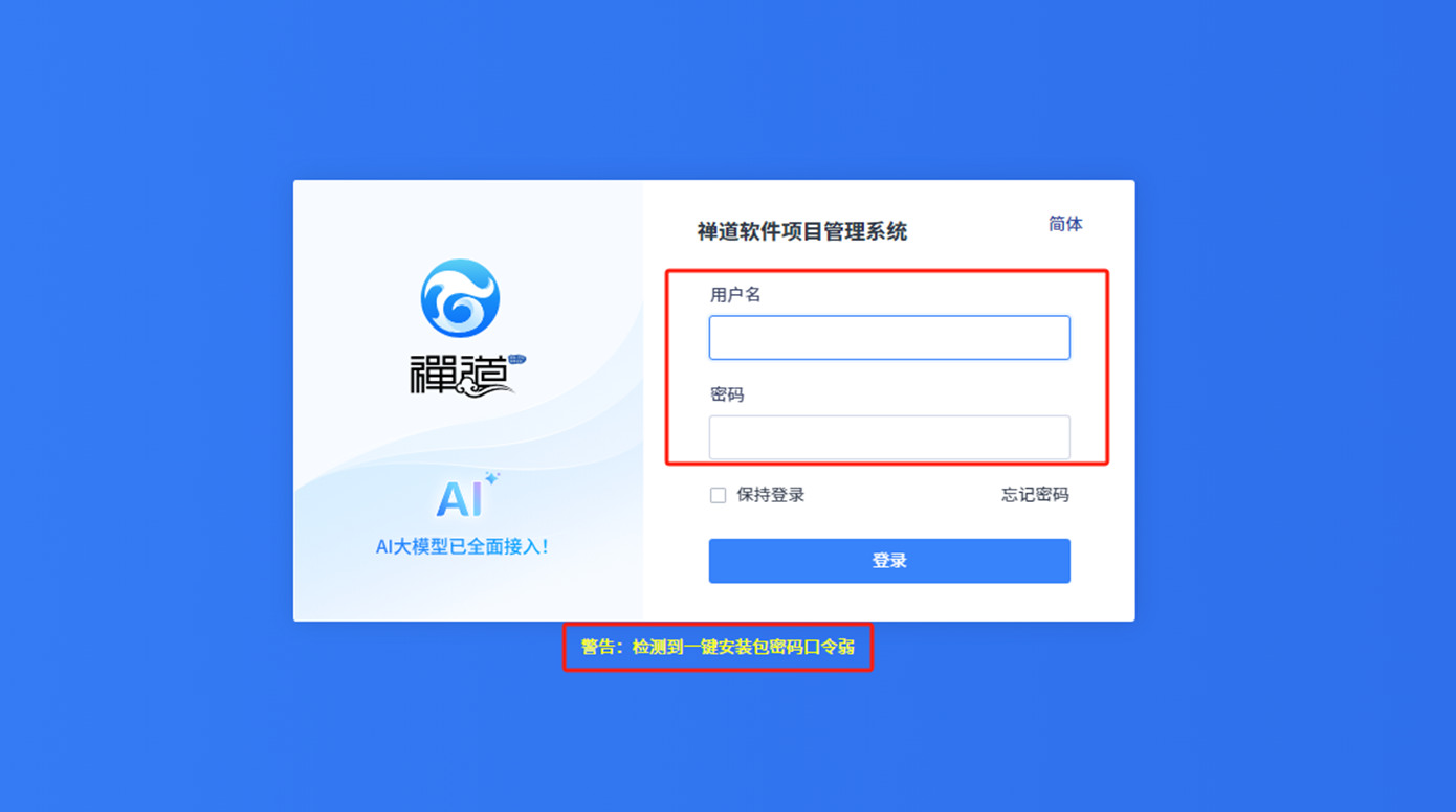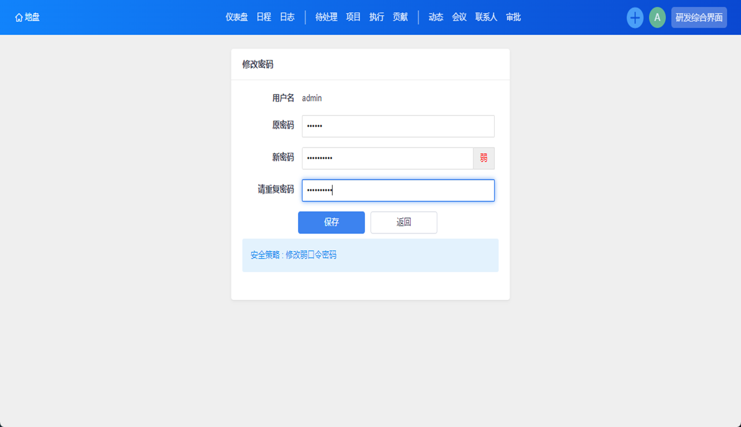 超级管理员登录禅道后,系统会自动检测密码安全级别,提示用户修改密码。按照提示进行修改后,点击按钮【保存】,即为修改成功。