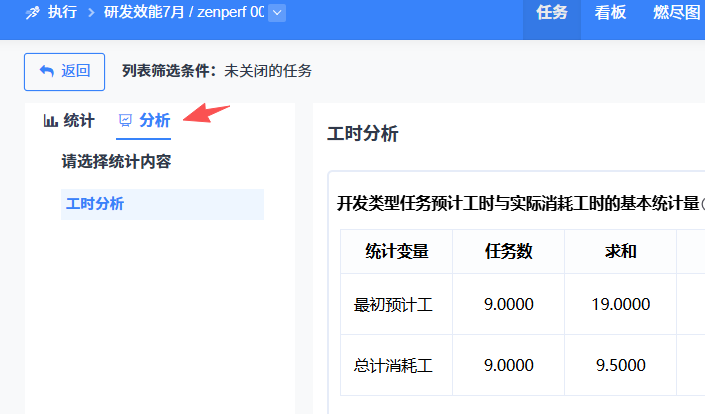 进入统计分析页面,禅道企业版、旗舰版和IPD版的用户可以在左侧列表中直接选择“工时分析”标签来查看相关内容。而开源版用户则需要在左侧列表中切换到“分析”标签进行查看。