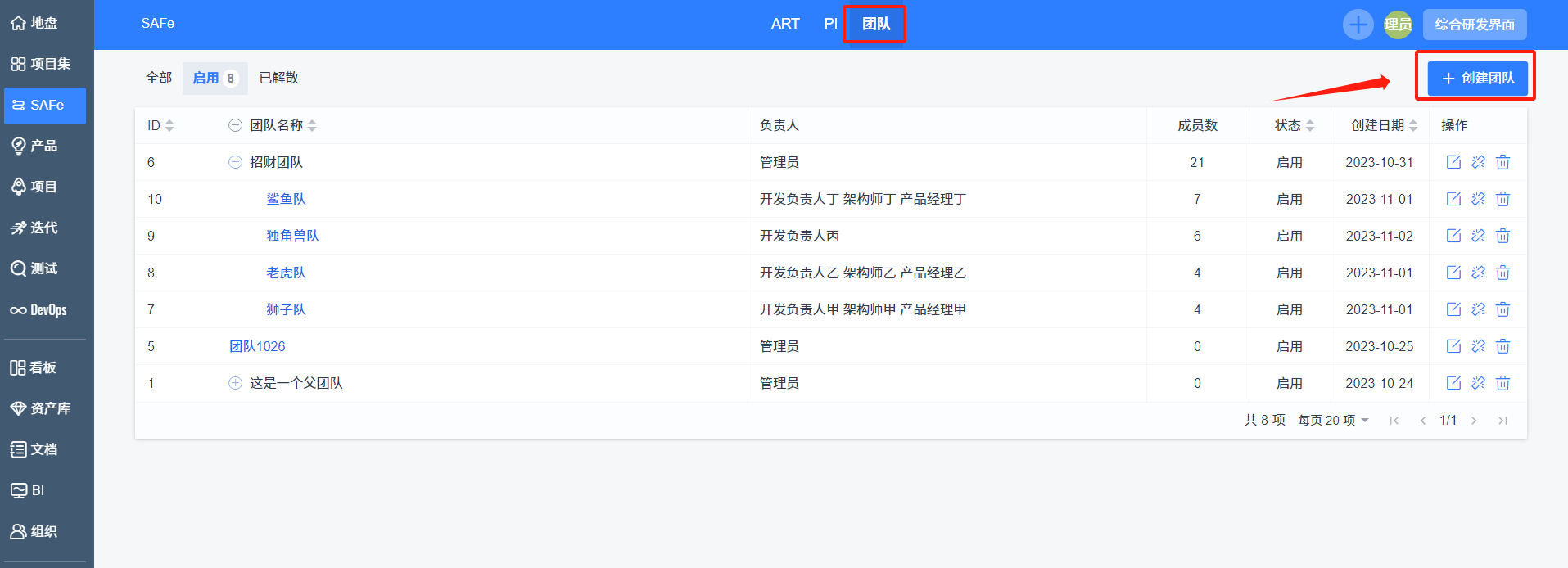 在SAFe和组织菜单下,都可以找到团队管理的功能。