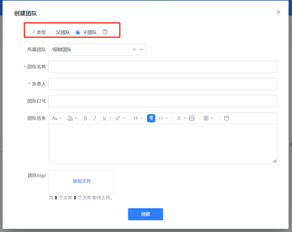 创建团队时,可以选择创建父团队或子团队。