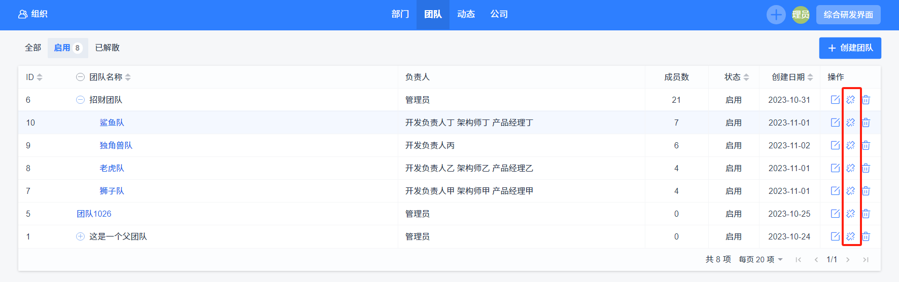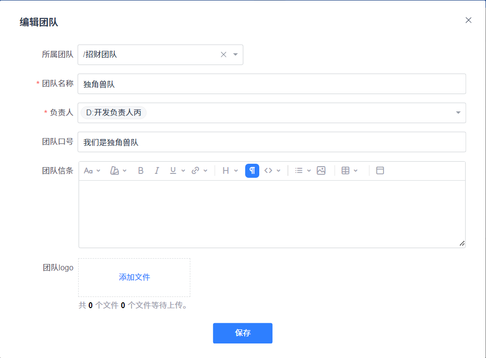 不论创建父团队或者子团队,都要给团队起一个团队名,增加团队的负责人,负责人可以是多个。