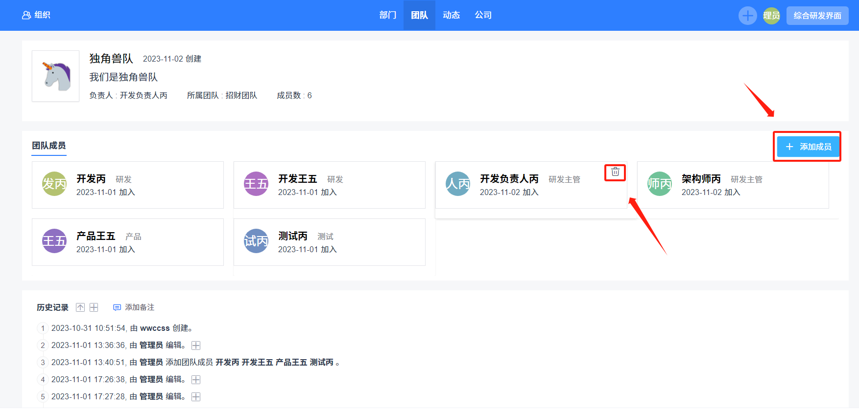 创建子团队后,在团队详情页面,就可以添加和移除成员了。