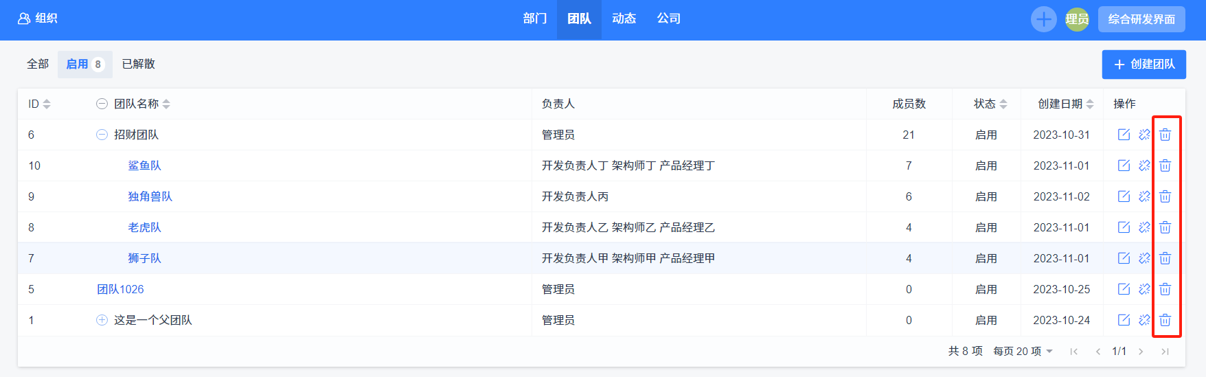 注意:如果团队已经关联过项目与执行、ART和PI,团队将不支持删除。