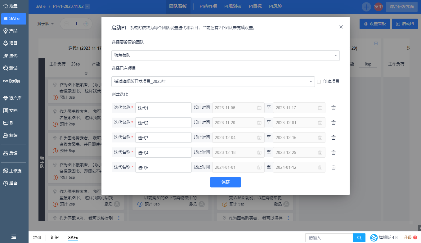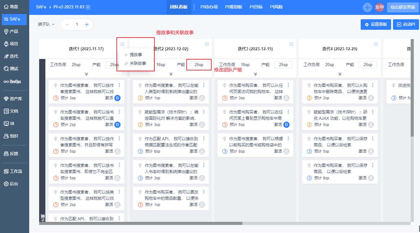 1. 您可以点击【启动PI】将规划的迭代正式在项目中建立真实的迭代,迭代会自动带入起止时间、团队成员、产品、用户故事等信息,这些信息将会互相同步。后续您可以【执行】中拆解任务,完成工作。
