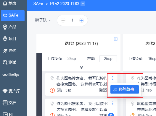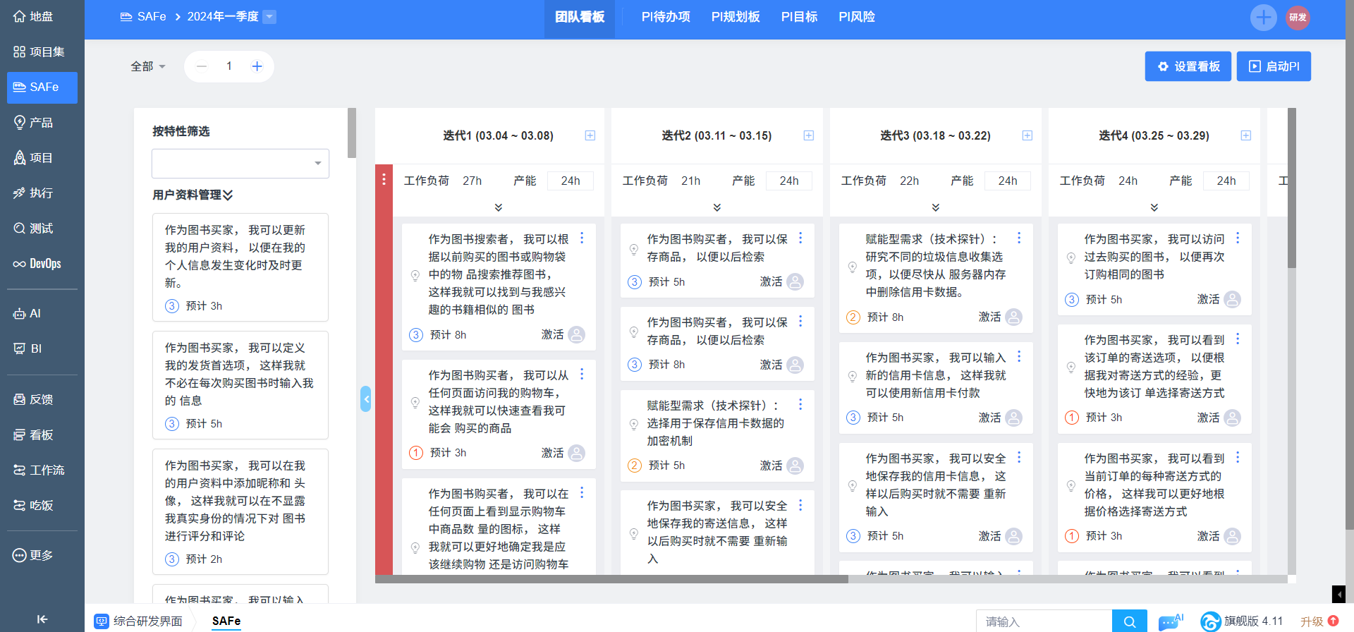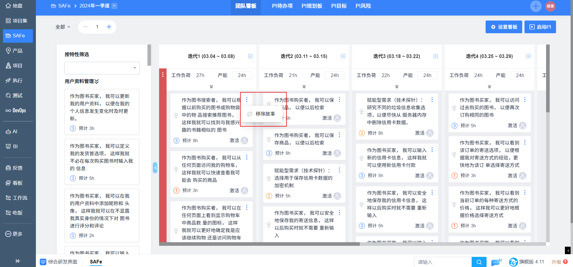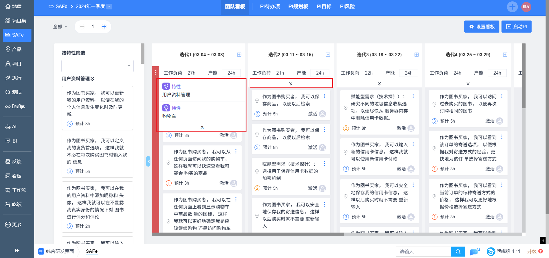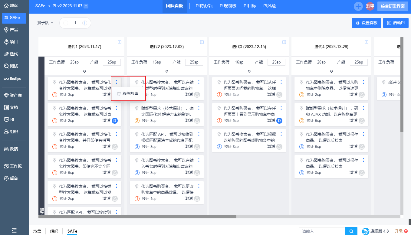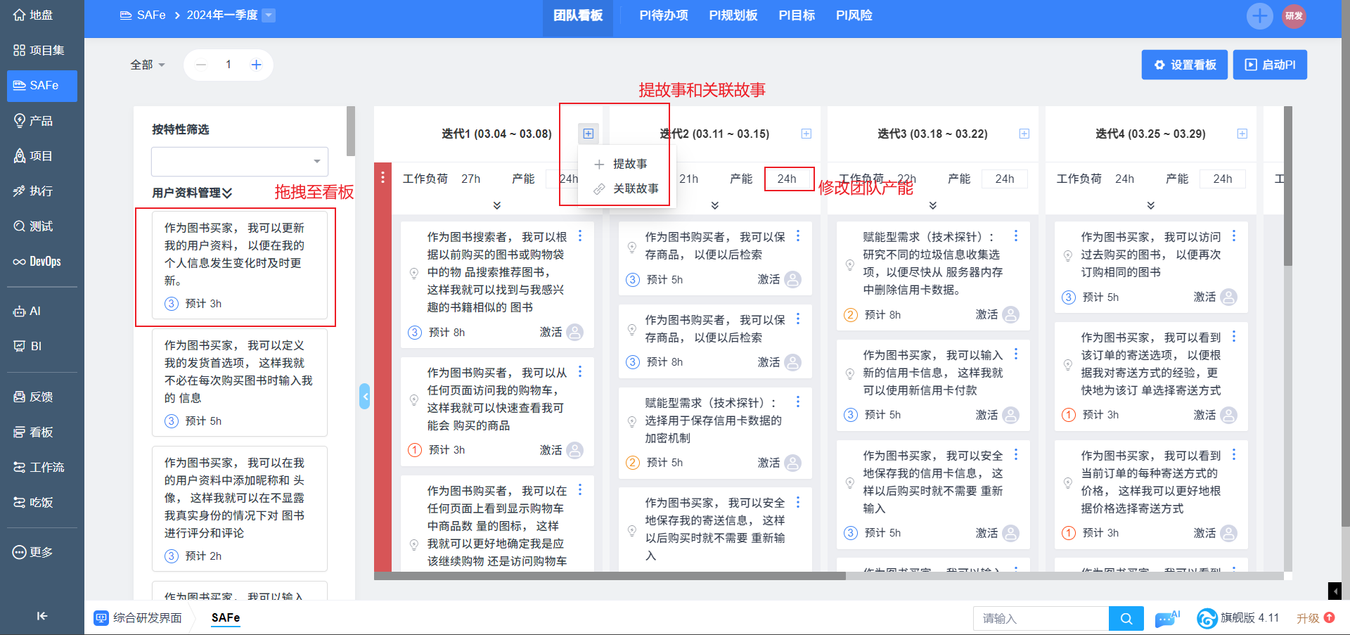 3. 左侧Backlog区展示本期PI待办特性下关联的所有故事,用户可以将故事拖拽进自己的团队看板。Backlog区域可以收起。