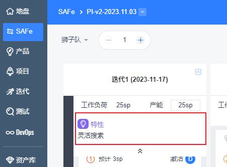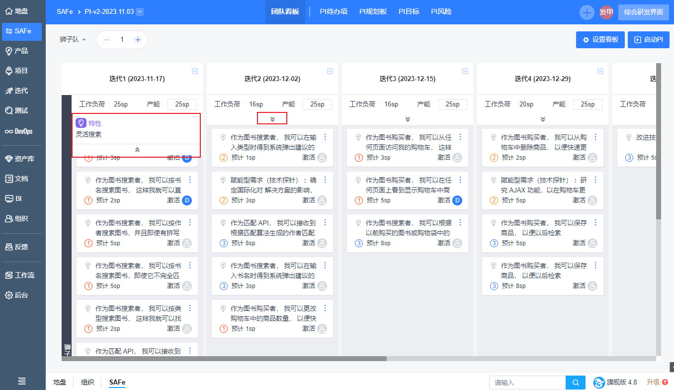 1. 每个团队认领完特性后,可以到自动生成的【团队看板】页面,将特性进行细化、拆分,并调整优先级,通过迭代、目标与风险列,实现可视化管理。