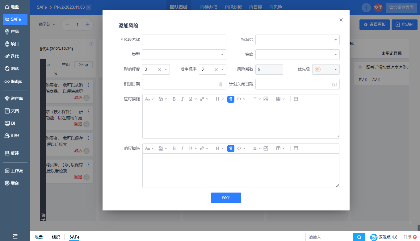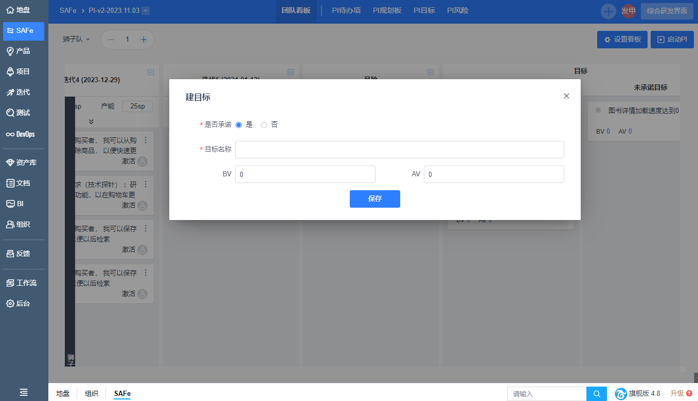 在【团队看板】右侧,可直接维护目标和风险项,团队可以维护自己的已承诺的目标和未承诺的目标,对BV和AV进行打分。