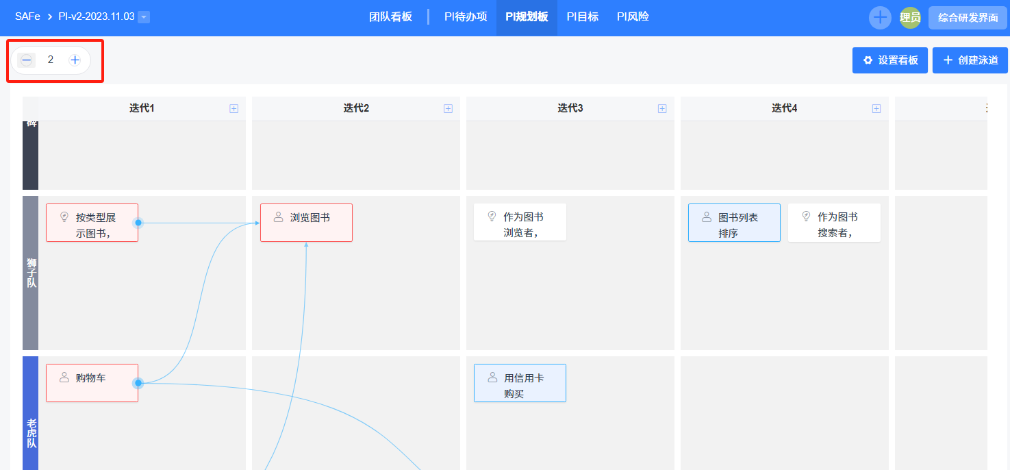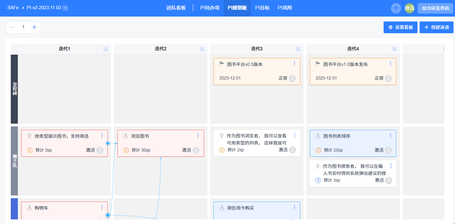 当每个团队明确接下来的PI阶段的目标、计划后,可以点击【PI规划板】,关联产品特性、里程碑、故事等等,并将有依赖关系的卡片进行连接。方便多个团队之间识别依赖项。