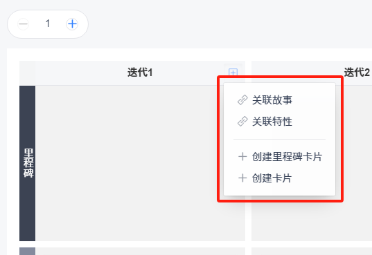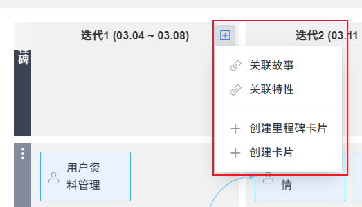 在PI 规划板中,点击看板列的右上角,可以添加里程碑、特性、需求和普通卡片。